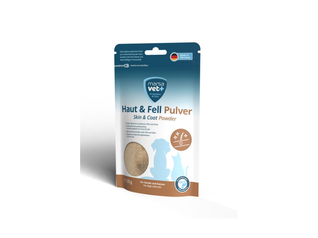 Prášek na pokožku a srst obsahuje cenné složky, které byly speciálně vyvinuty pro péči o pokožku a výměnu srsti. Zejména vysoký obsah linolové kyseliny, důležité omega-6 mastné kyseliny, která je zásadní pro pokožku a srst, je výjimečný. Linolová kyselina podporuje přirozenou bariérovou funkci pokožky. Společně s EPA a DHA tato kombinace mastných kyselin zajišťuje, že srst zůstává silná a lesklá.